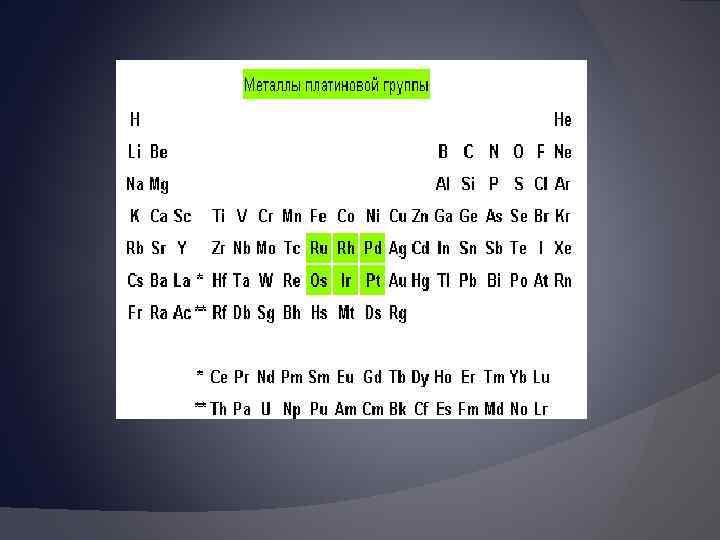 5 Me платиновой группы 1. Рутений 2. Родий 3. Палладий 4. Осмий 5. Иридий