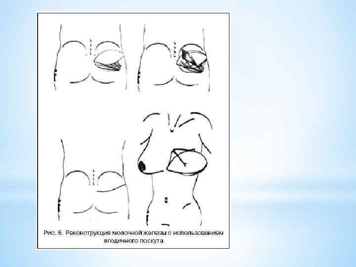 Реже применяемыми свободными лоскутами для реконструкции молочной железы являются модификации ягодичного лоскута (верхний или нижний) и так называемый лоскут Рубенса, который представляет собой кожно-жировой лоскут подвздошной области с частью надкостницы крыла подвздошной кости с питанием из глубоких нижних подвздошных сосудов, а также вертикальная и горизонтальная модификации латерального лоскута бедра (рис. 5). Эти лоскуты используют при невозможности применения других методик и в тактически сложных ситуациях, например, при раке контралатеральной молочной железы, после выполненной реконструкции ТРАМ-лоскутом. Следует признать, что общим недостатком кожно-мышечных лоскутов является функциональное повреждение донорской зоны при удалении части или всей мышцы, содержащей питающие сосуды. Данная проблема была решена путем разработки перфорантных кожно-жировых лоскутов, при мобилизации которых не задействована мышца донорской зоны. Это лоскуты на перфорантах торакодорзальной (ТАР), глубокой нижней эпигастральной (DIEP) и верхней ягодичной (S-GAP) артерий, а также перфорантный латеральный лоскут бедра (LTP).