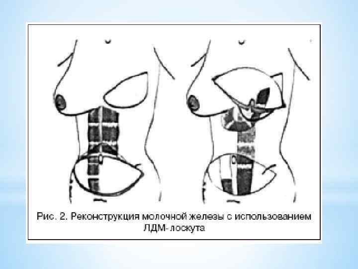 Недостатки ЛДМ-лоскута: нередко наличие очень заметного рубца в донорской зоне с деформацией контура спины при заборе большого объема широчайшей мышцы спины; обширная поверхность рубцов в области реконструированной железы в совокупности с контрастом кожи грудной стенки и лоскута. Длительно персистирующие серомы в донорской зоне наблюдаются примерно в 80% случаев, что иногда приводит к ухудшению заживления раны. Для уменьшения травмы, наносимой донорской зоне, в последнее время используют методики эндоскопической мобилизации лоскута из широчайшей мышцы спины, а также варианты перфорантного лоскута, когда торакодорзальные сосуды выделяются вплоть до перфорантов, входящих в лоскут, а мышца при этом сохраняется. ТРАМ-лоскут обладает наибольшей популярностью среди методов реконструкции молочной железы во всем мире, что позволило назвать его в 1990 -х гг. «золотым стандартом» . Практически у любой пациентки, имеющей достаточное количество жировой ткани на передней брюшной стенке, существует возможность ее перемещения в область грудной стенки с целью реконструкции с восстановлением полного объема без использования имплантатов.