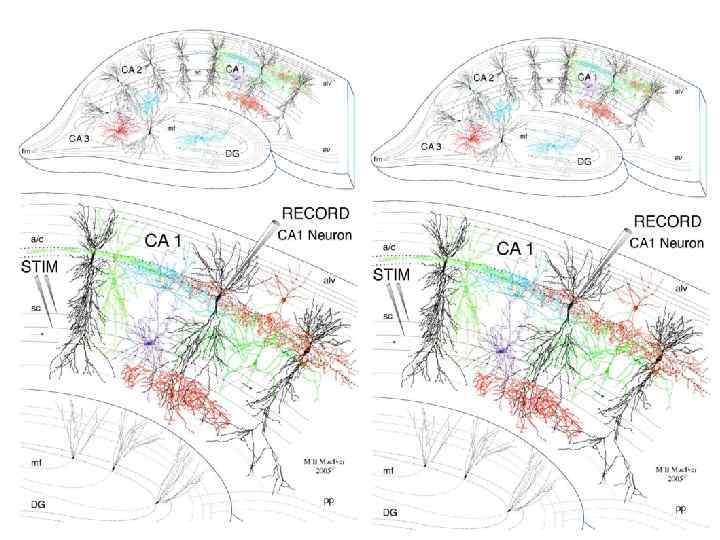 Постсинаптическая пластичность Ассоциативная ДВП в переживающих срезах гиппокампа кролика представляет собой результат ассоциации возбуждения двух афферентных путей. В экспериментах пирамидные нейроны поля СА 1 стимулируют через два пути: 1) «слабая» стимуляция коммисуральных входов, которая вызывает слабый ПСП. 2) «сильная» стимуляция коллатералей Шаффера (входы от нейронов CA 3), которая вызывает существенно больший ПСП.