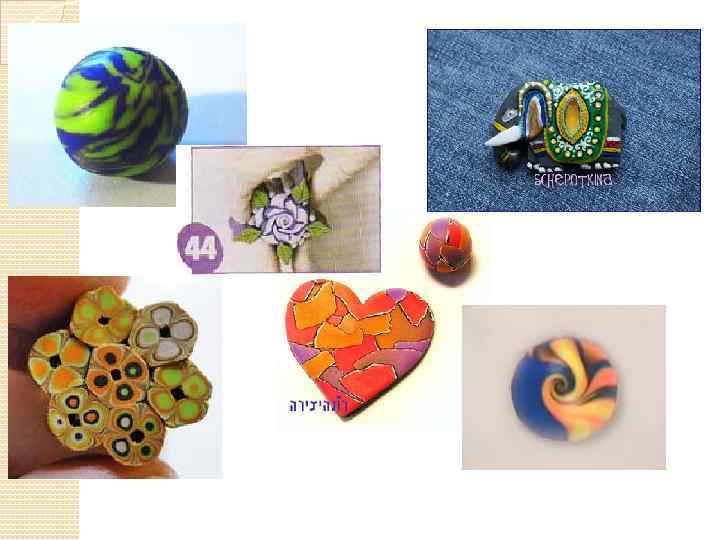 ТЕХНИКА БЕЗОПАСНОСТИ 1. 2. 3. 4. 5. Пластификатор может повредить некоторые инструменты, так же вступает в реакцию с некоторыми видами пластики. Не используйте полимерную глину для декорирования посуды и прочих вещей, которые напрямую соприкасаются с губами или едой. При использовании пластики детьми, взрослый должен находится рядом. Дети должны быть достаточно взрослыми. Очищайте руки влажными салфетками во время работы с пластикой. После работы, тщательно вымойте руки с мылом!!! Не превышайте температуру обжига.