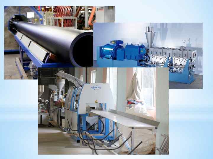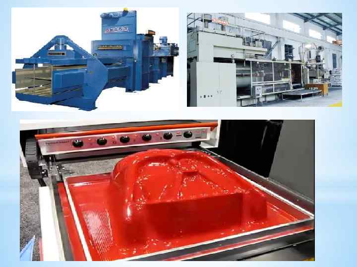 В основном при производстве пластмасс используют один из семи способов: - прессование - литьем под давлением - экструзия (выдавливание) - штампование - выдувание - каландро-вание - механическая обработка