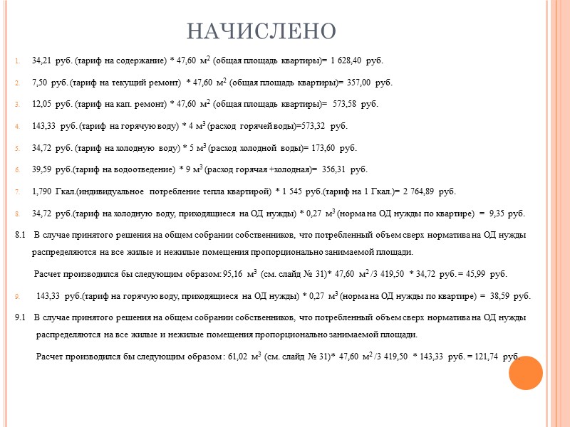 Вид платежа, по которым производятся начисления: жилищные услуги, коммунальные услуги, общедомовые нужды, прочие услуги,. Единицы измерения норматива и сам норматив на индивидуальное потребления общедомовым нужды. Утверждённые тарифы на жилищно-коммунальные услуги. 13/1. Расчетная ставка потребления жилищно-коммунальных услуг. Количественный показатель приходящегося объёма жилищно-коммунального ресурса на данное помещение. Объем коммунальных услуг на общедомовые нужды, приходящийся на соответствующее помещение в многоквартирном доме. Информация о переплате или задолженности за предыдущие периоды. Итоговая сумма к оплате по каждому виду жилищно-коммунальных услуг. Информация о перерасчетах. Сумма начислений по услугам.