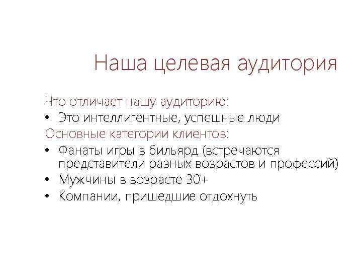Наша целевая аудитория Что отличает нашу аудиторию: • Это интеллигентные, успешные люди Основные категории клиентов: • Фанаты игры в бильярд (встречаются представители разных возрастов и профессий) • Мужчины в возрасте 30+ • Компании, пришедшие отдохнуть