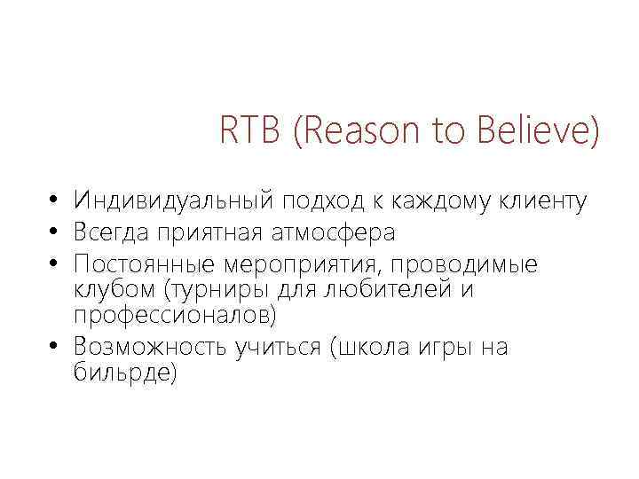 RTB (Reason to Believe) • Индивидуальный подход к каждому клиенту • Всегда приятная атмосфера • Постоянные мероприятия, проводимые клубом (турниры для любителей и профессионалов) • Возможность учиться (школа игры на бильрде)