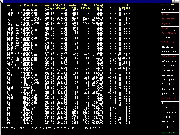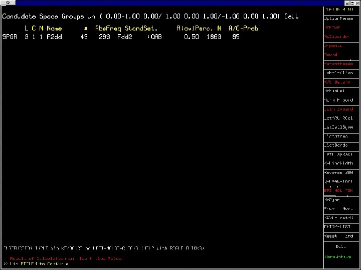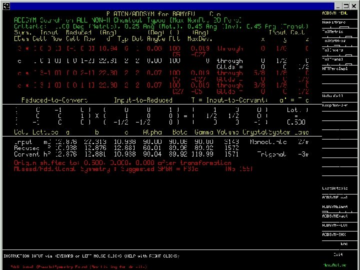 NEWSYM • Companion to ADDSYM Analysis • Structure factors calculated from current cell, symmetry and coordinate info. • Determination of the Space Group from the systematic absences in F(calc) • Extinctions in F(calc) may differ from those in F(obs) due to poor data.