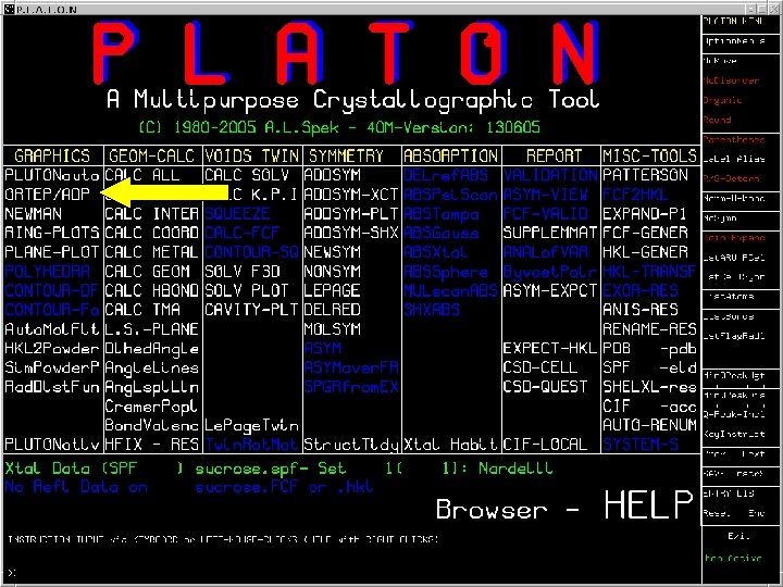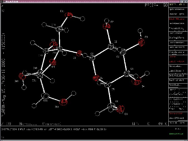 EXAMPLE • Input Shelx Style: sucrose. res • Alternatively: . cif, . pdb, . fdat, . spf style files • Invoke PLATON: UNIX: platon sucrose. res MS-Windows: via ‘Farrugia’ task menu • Opening Menu (4 areas)