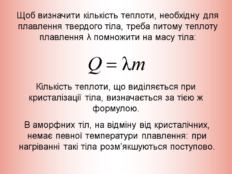 Питома теплота плавлення дорівнює кількості теплоти, яка необхідна для перетворення 1 кг речовини із твердого в рідкий стан при температурі плавлення. Питому теплоту плавлення позначають λ і вимірюють у джоулях на кілограм (Дж/кг).