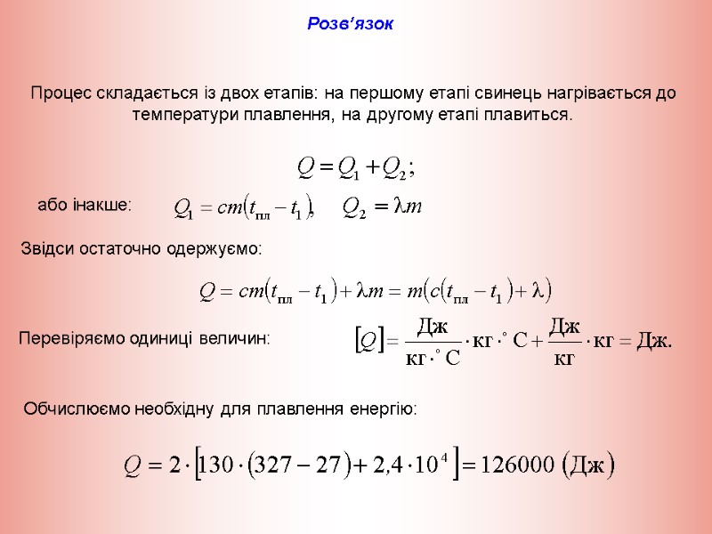 Задачі 1. Яку енергію необхідно затратити, щоб розплавити шматок свинцю масою m = 2кг, взятий при температурі t1 =27 °C?
