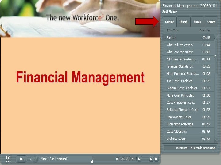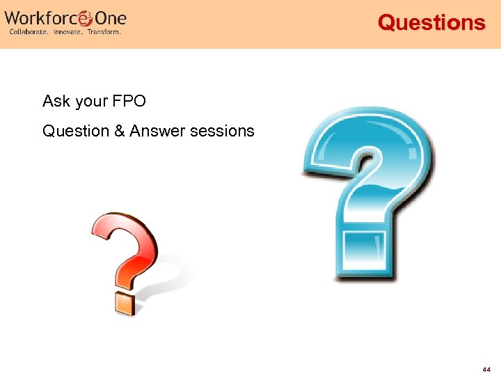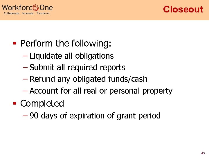 Closeout § Perform the following: – Liquidate all obligations – Submit all required reports – Refund any obligated funds/cash – Account for all real or personal property § Completed – 90 days of expiration of grant period 43