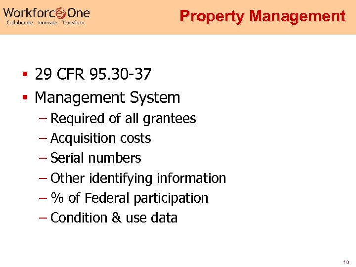 Property Management § 29 CFR 95. 30 -37 § Management System – Required of all grantees – Acquisition costs – Serial numbers – Other identifying information – % of Federal participation – Condition & use data 10