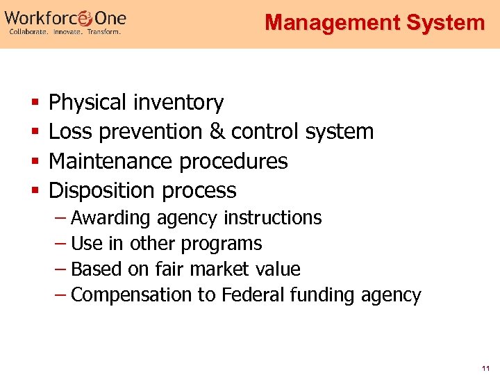 Management System § § Physical inventory Loss prevention & control system Maintenance procedures Disposition process – Awarding agency instructions – Use in other programs – Based on fair market value – Compensation to Federal funding agency 11