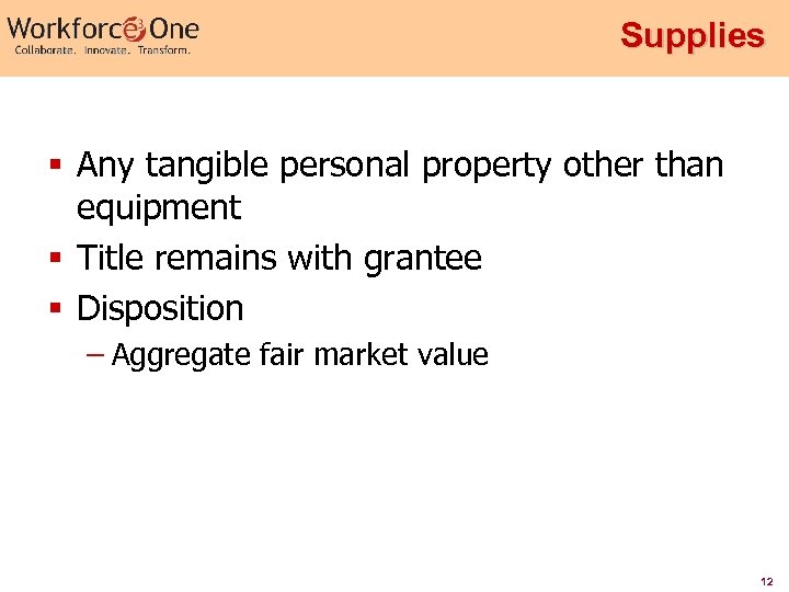 Supplies § Any tangible personal property other than equipment § Title remains with grantee § Disposition – Aggregate fair market value 12