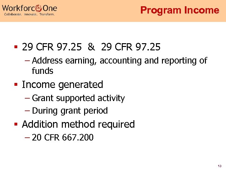 Program Income § 29 CFR 97. 25 & 29 CFR 97. 25 – Address earning, accounting and reporting of funds § Income generated – Grant supported activity – During grant period § Addition method required – 20 CFR 667. 200 13