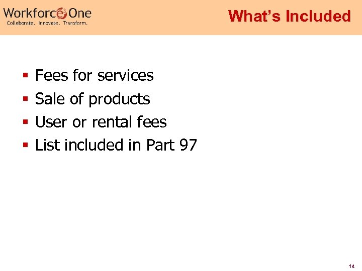 What’s Included § § Fees for services Sale of products User or rental fees List included in Part 97 14