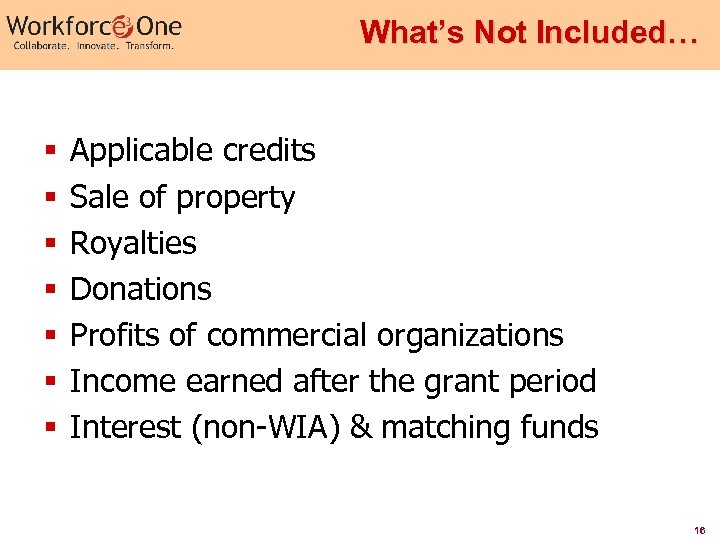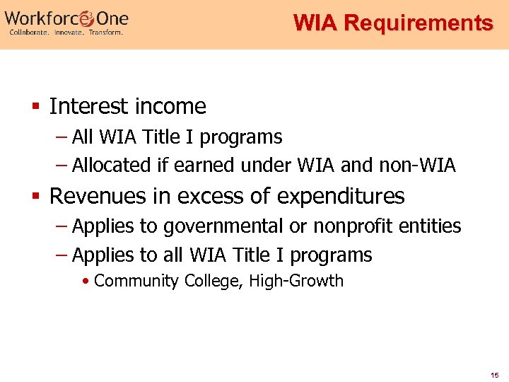 WIA Requirements § Interest income – All WIA Title I programs – Allocated if earned under WIA and non-WIA § Revenues in excess of expenditures – Applies to governmental or nonprofit entities – Applies to all WIA Title I programs • Community College, High-Growth 15