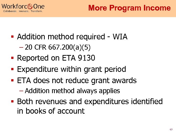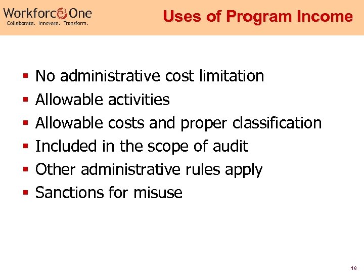 More Program Income § Addition method required - WIA – 20 CFR 667. 200(a)(5) § Reported on ETA 9130 § Expenditure within grant period § ETA does not reduce grant awards – Addition method always applies § Both revenues and expenditures identified in books of account 17