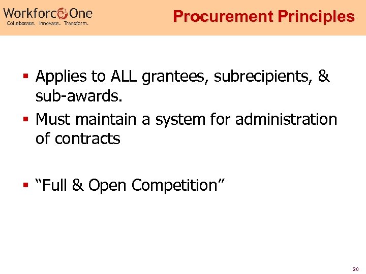 Procurement Principles § Applies to ALL grantees, subrecipients, & sub-awards. § Must maintain a system for administration of contracts § “Full & Open Competition” 20