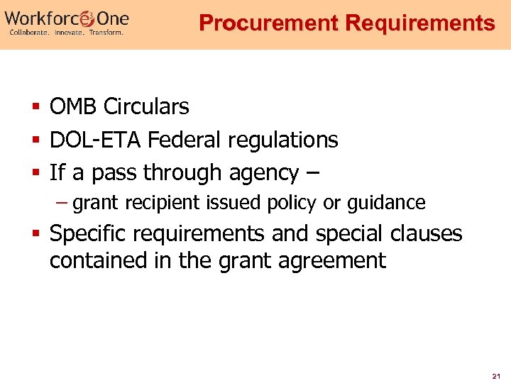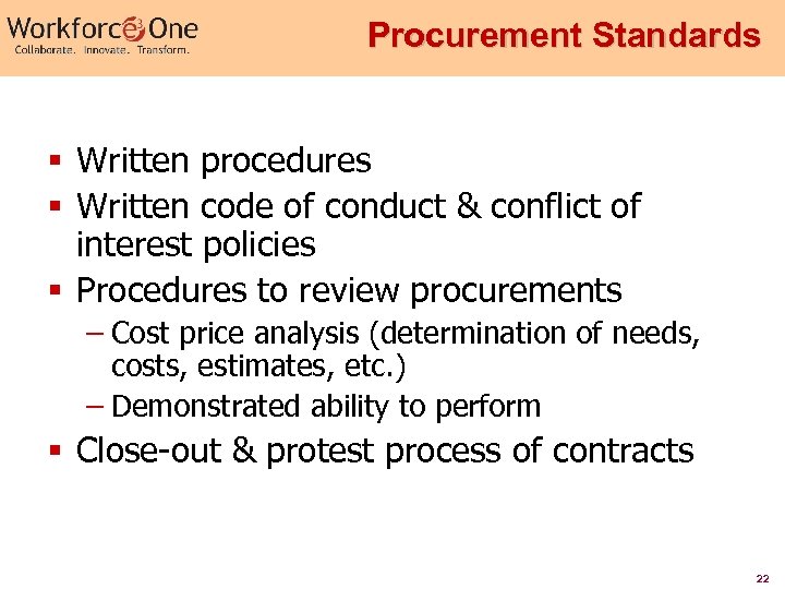 Procurement Requirements § OMB Circulars § DOL-ETA Federal regulations § If a pass through agency – – grant recipient issued policy or guidance § Specific requirements and special clauses contained in the grant agreement 21