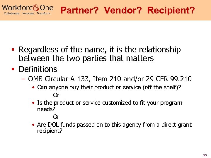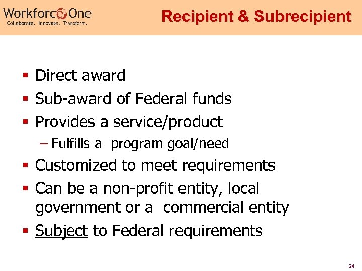 Partner? Vendor? Recipient? § Regardless of the name, it is the relationship between the two parties that matters § Definitions – OMB Circular A-133, Item 210 and/or 29 CFR 99. 210 • Can anyone buy their product or service (off the shelf)? Or • Is the product or service customized to fit your program needs? Or • Are DOL funds passed on to this agency from a direct grant recipient? 23