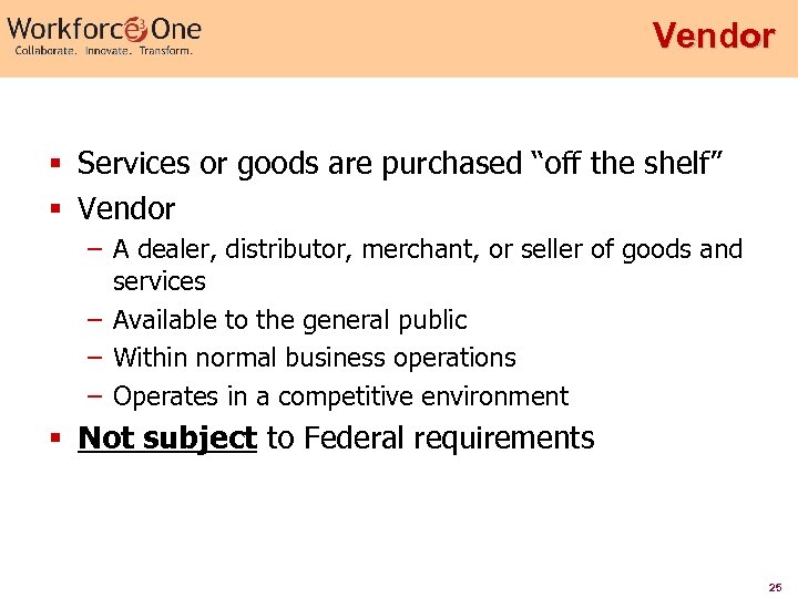 Recipient & Subrecipient § Direct award § Sub-award of Federal funds § Provides a service/product – Fulfills a program goal/need § Customized to meet requirements § Can be a non-profit entity, local government or a commercial entity § Subject to Federal requirements 24
