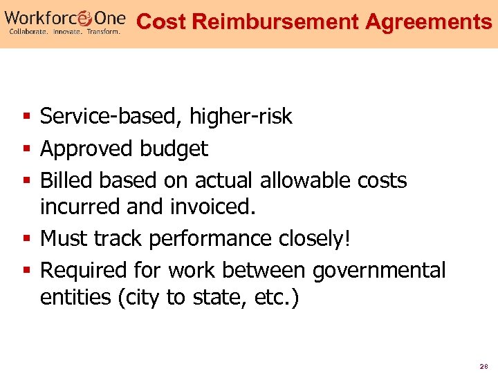 Cost Reimbursement Agreements § Service-based, higher-risk § Approved budget § Billed based on actual allowable costs incurred and invoiced. § Must track performance closely! § Required for work between governmental entities (city to state, etc. ) 28