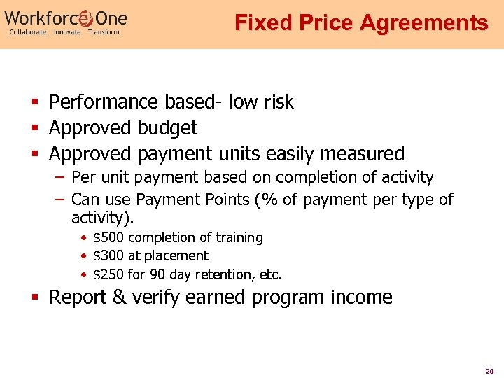 Fixed Price Agreements § Performance based- low risk § Approved budget § Approved payment units easily measured – Per unit payment based on completion of activity – Can use Payment Points (% of payment per type of activity). • $500 completion of training • $300 at placement • $250 for 90 day retention, etc. § Report & verify earned program income 29