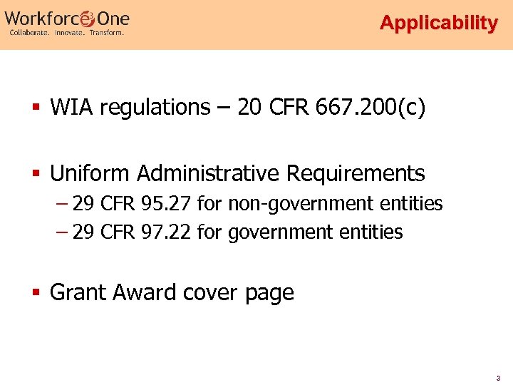Applicability § WIA regulations – 20 CFR 667. 200(c) § Uniform Administrative Requirements – 29 CFR 95. 27 for non-government entities – 29 CFR 97. 22 for government entities § Grant Award cover page 3