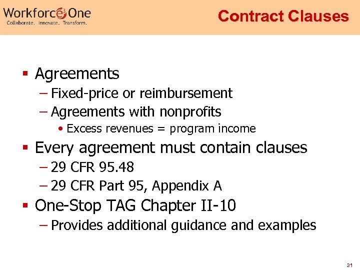 Contract Clauses § Agreements – Fixed-price or reimbursement – Agreements with nonprofits • Excess revenues = program income § Every agreement must contain clauses – 29 CFR 95. 48 – 29 CFR Part 95, Appendix A § One-Stop TAG Chapter II-10 – Provides additional guidance and examples 31