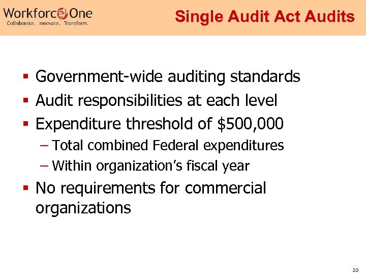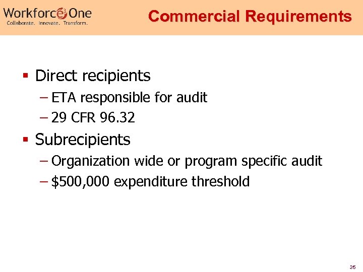 Commercial Requirements § Direct recipients – ETA responsible for audit – 29 CFR 96. 32 § Subrecipients – Organization wide or program specific audit – $500, 000 expenditure threshold 35