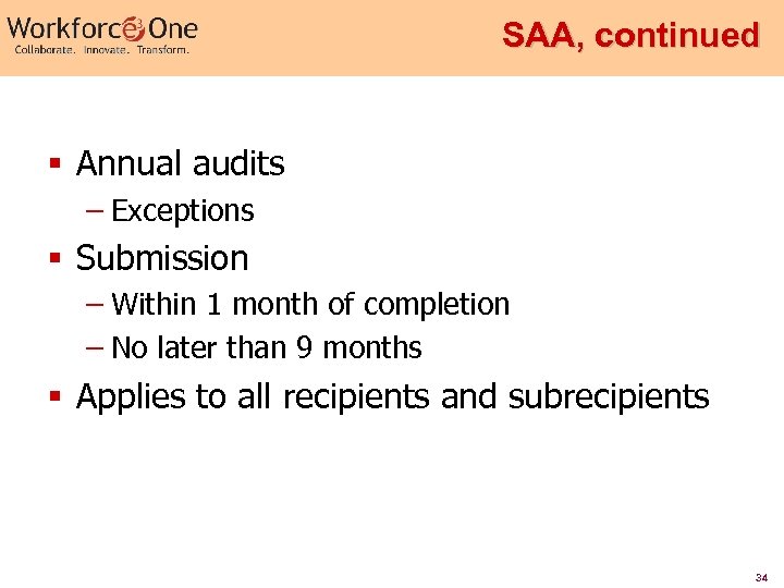Single Audit Act Audits § Government-wide auditing standards § Audit responsibilities at each level § Expenditure threshold of $500, 000 – Total combined Federal expenditures – Within organization’s fiscal year § No requirements for commercial organizations 33