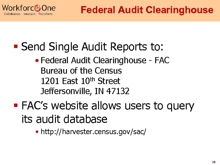 Federal Audit Clearinghouse § Send Single Audit Reports to: • Federal Audit Clearinghouse - FAC Bureau of the Census 1201 East 10 th Street Jeffersonville, IN 47132 § FAC’s website allows users to query its audit database • http: //harvester. census. gov/sac/ 36