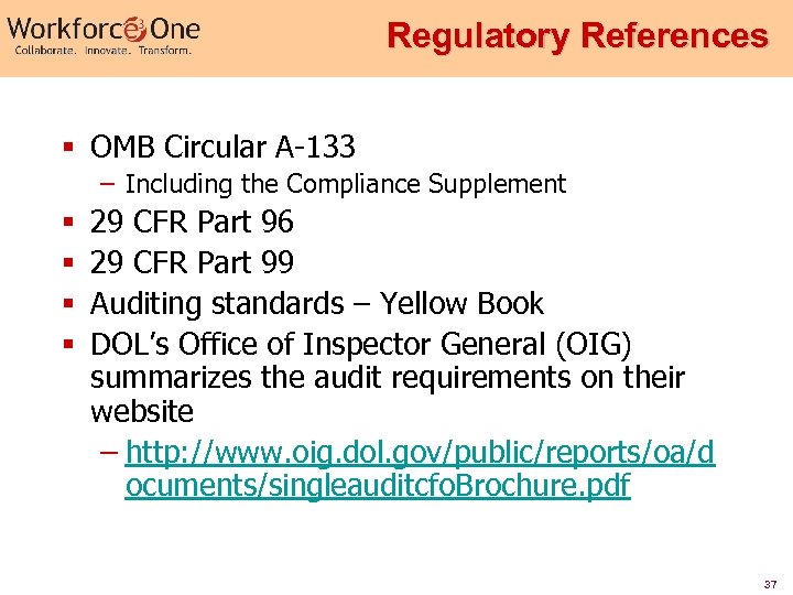 Regulatory References § OMB Circular A-133 – Including the Compliance Supplement § § 29 CFR Part 96 29 CFR Part 99 Auditing standards – Yellow Book DOL’s Office of Inspector General (OIG) summarizes the audit requirements on their website – http: //www. oig. dol. gov/public/reports/oa/d ocuments/singleauditcfo. Brochure. pdf 37