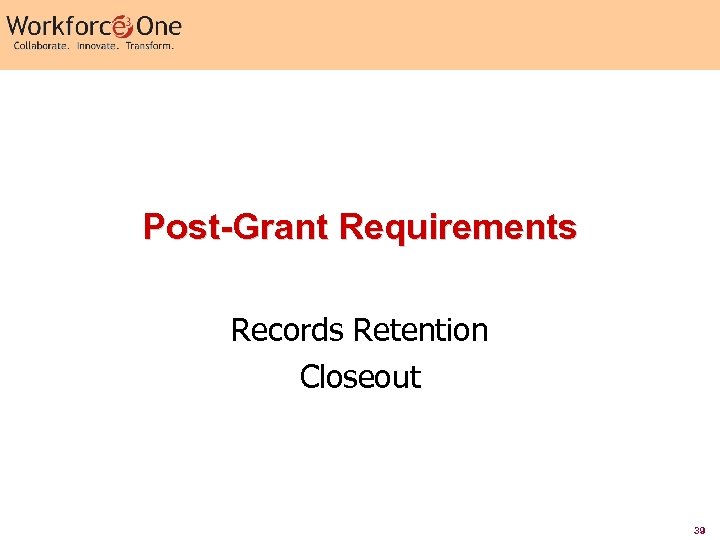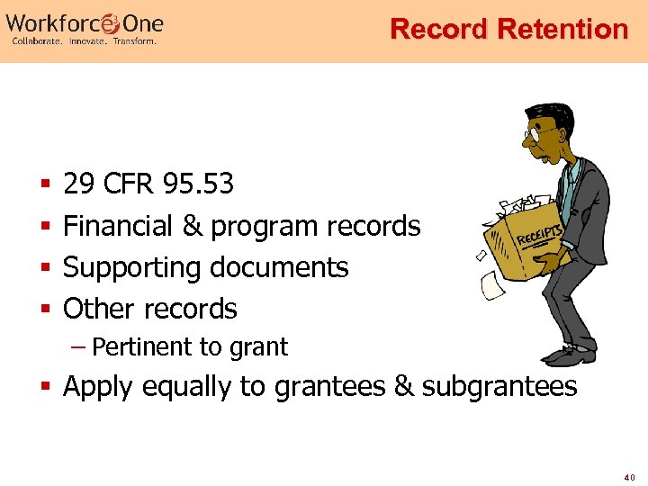 Record Retention § § 29 CFR 95. 53 Financial & program records Supporting documents Other records – Pertinent to grant § Apply equally to grantees & subgrantees 40