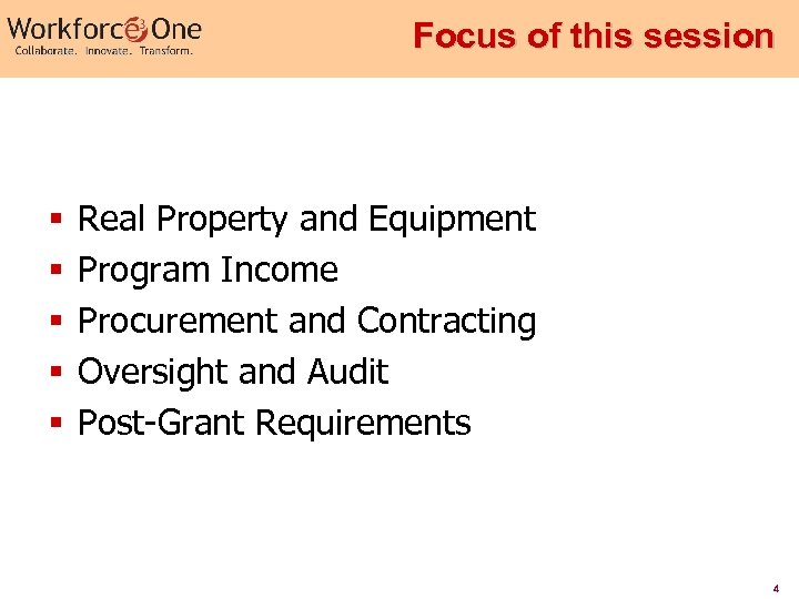 Focus of this session § § § Real Property and Equipment Program Income Procurement and Contracting Oversight and Audit Post-Grant Requirements 4