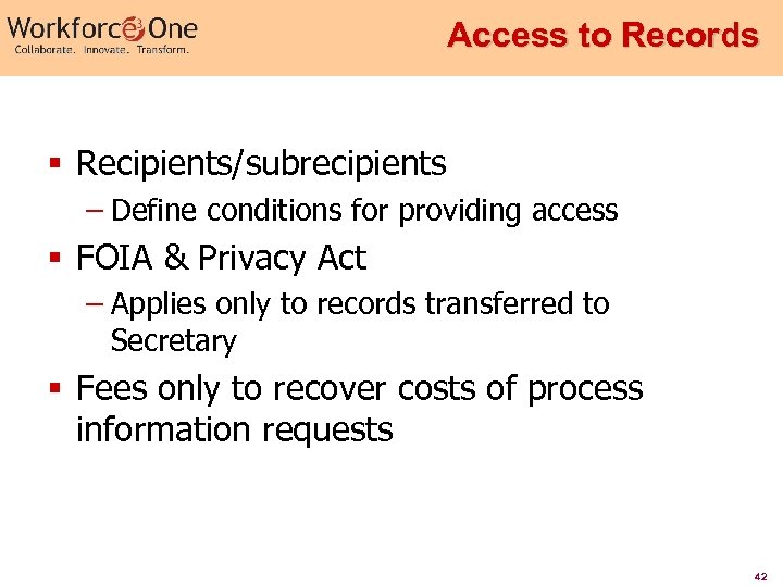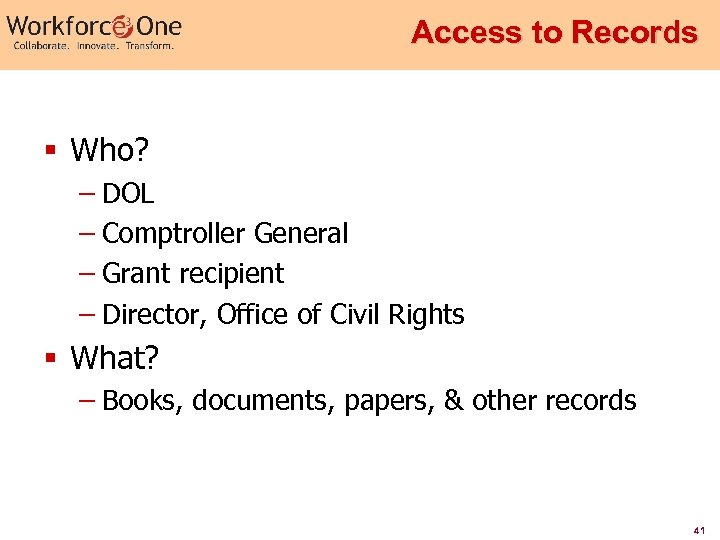 Access to Records § Who? – DOL – Comptroller General – Grant recipient – Director, Office of Civil Rights § What? – Books, documents, papers, & other records 41