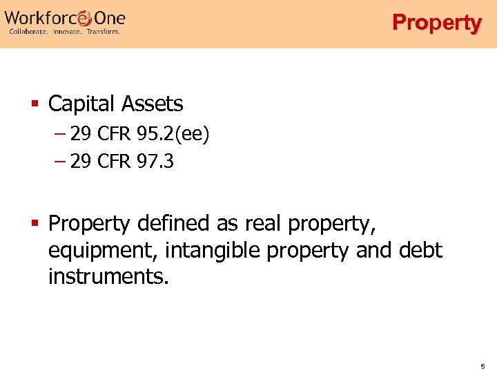 Property § Capital Assets – 29 CFR 95. 2(ee) – 29 CFR 97. 3 § Property defined as real property, equipment, intangible property and debt instruments. 5