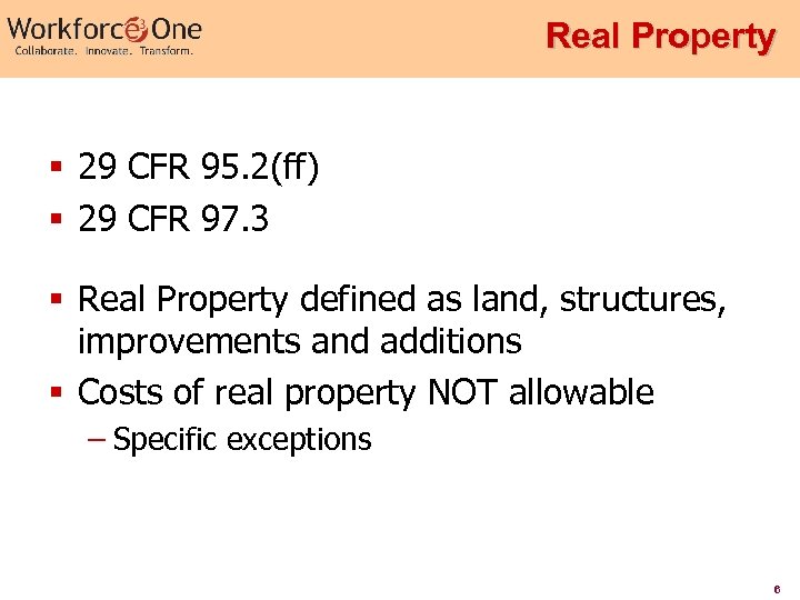 Real Property § 29 CFR 95. 2(ff) § 29 CFR 97. 3 § Real Property defined as land, structures, improvements and additions § Costs of real property NOT allowable – Specific exceptions 6