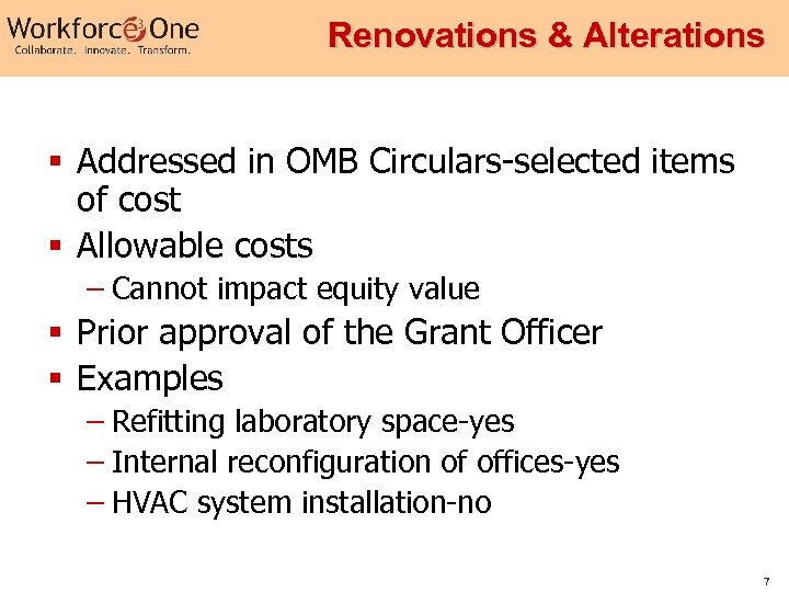Renovations & Alterations § Addressed in OMB Circulars-selected items of cost § Allowable costs – Cannot impact equity value § Prior approval of the Grant Officer § Examples – Refitting laboratory space-yes – Internal reconfiguration of offices-yes – HVAC system installation-no 7