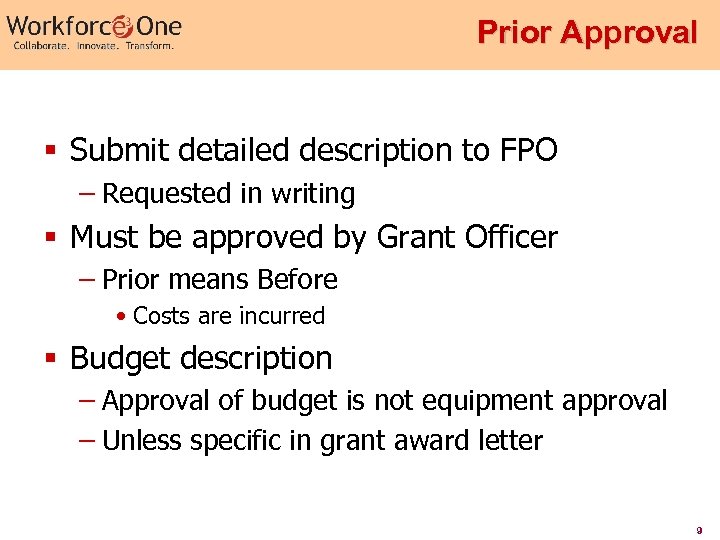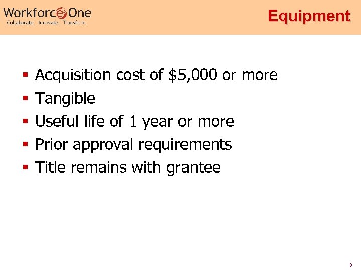 Equipment § § § Acquisition cost of $5, 000 or more Tangible Useful life of 1 year or more Prior approval requirements Title remains with grantee 8