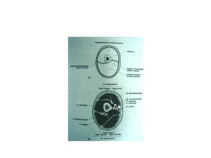 Плечевое сплетение. Длинные и короткие ветви С 5 Надключичные ветви n. DS – n. dorsalis scapulae С 6 n. Th. L – n. thoracicus longus n. SSc – С 7 n. suprascapularis n. Sc – n. subclavius С 8 Подключичные ветви Подключичные (длинные) ветви плечевого сплетения n. DS n. M-c – n. Musculocutaneus n. R – n. Radialis n. SSc n. M – n. Medianus n. U – n. Ulnaris n. Sc n. Pl n. SSS n. M-c n. SSI n. M n. Pm n. CAM n. CBM n. U n. R Th 1 n. Th. L n. Pl – n. pectoralis lat. n. SSS – n. subscap. sup n. SSI – n. subscap. inf n. CBM – n. cutaneus brachii med. n. CAM – n. cutaneus antebrachii med Корешки сплетения (rami anteriores nn. spinales) Стволы (Trunci superior, medius et inferior) Разделения (Divisiones anteriores (к сгибателям) et posteriores (к разгибателям) Пучки (Fasciculi: lateralis, medialis*et posterior, окружают a. subclavia)