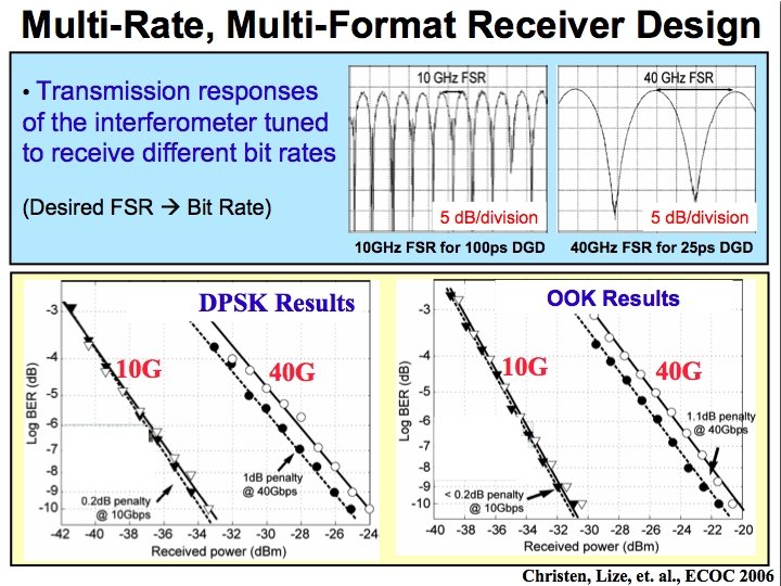 Benefit vs. Complexity: Integration Modulation format Hardware complexity Req. OSNR NRZ-OOK Duobinary 17. 4 d. B Mach-Zehnder modulator Data 16. 5 d. B Precoded Data LP 33% RZ-OOK 14. 9 d. B 67% CSRZ 15. 1 d. B 33% RZ-DPSK 11. 0 d. B 67% RZ-DPSK 11. 1 d. B 50% RZ-DQPSK 12. 2 d. B Data Clock Delay interferometer Precoded Data Clock p/2 Precoded Data • Coherent Detection Laser LO and 90 -degree hybrid RF post-processing and increased sensitivity Control A. Gnauck, P. Winzer, R. Essiambre, 2005