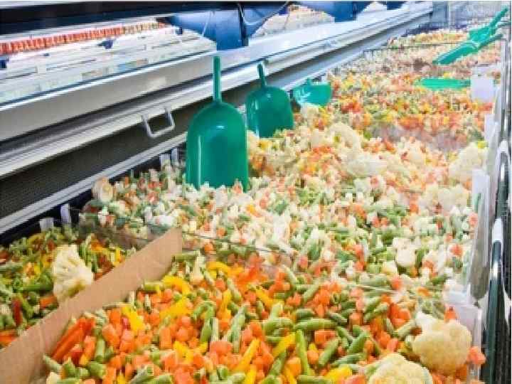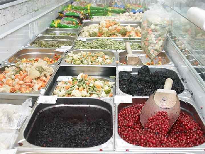 Классификация и характеристика ассортимента v Замораживанию подвергают практически все сочные плоды (кроме цитрусовых), овощи, а также десертные, обеденные блюда и полуфабрикаты из них. Ø Из замороженных овощей производят картофель; капусту цветную, брюссельскую, брокколи; морковь; зеленый горошек; фасоль стручковую; шпинат; томаты; перец. Ø Из плодов вырабатывают замороженные вишню, черешню, сливы, абрикосы, персики, черную и красную смородину, землянику, облепиху, чернику, малину, клюкву, крыжовник, семечковые плоды (яблоки, груши). Могут вырабатываться смеси целых плодов с пюре.