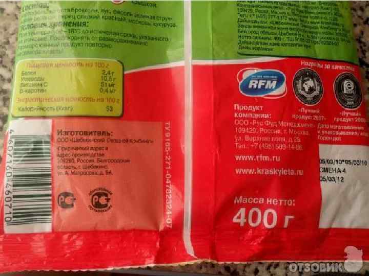 Факторы, сохраняющие качество Упаковка Быстрозамороженные плодоовощные товары могут упаковываться также в пакеты из полиамид-целлофана. В качестве потребительской тары также могут использоваться пачки из ламинированного картона с вкладышем из пергамента, целлофана, полиэтилена или другого непроницаемого для влаги материала или без вкладышей. Упаковка для плодоовощной замороженной продукции различается также в зависимости от того, кому поставляется продукция. Для конечных потребителей она фасуется, как правило, в пакеты из ламинированной бумаги или полиэтиленовой пленки марки Н "пищевая" или в пакеты из полиамидцеллофана, массой нетто продукта от 250 г до 1 кг в зависимости от вида сырья; в пачки из ламинированного картона массой нетто продукта до 1, 0 кг. Допускается использовать другие виды пленок и тароупаковочных материалов, разрешенных для упаковывания пищевых продуктов Роспотребнадзором РФ.