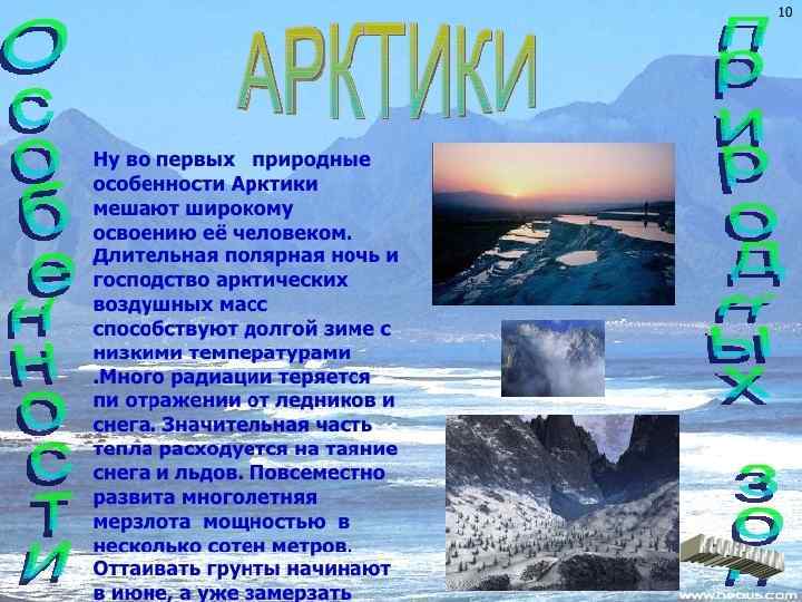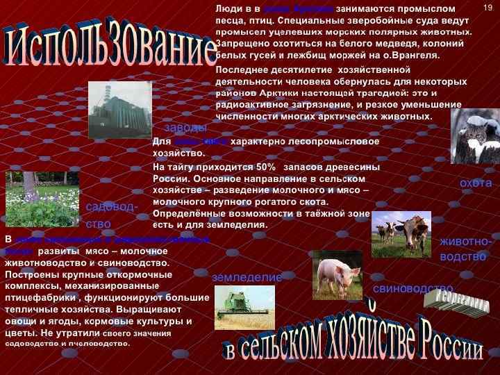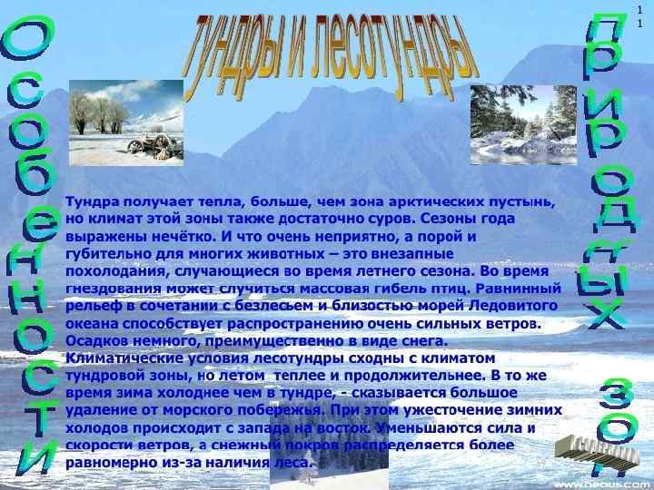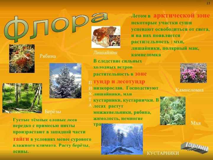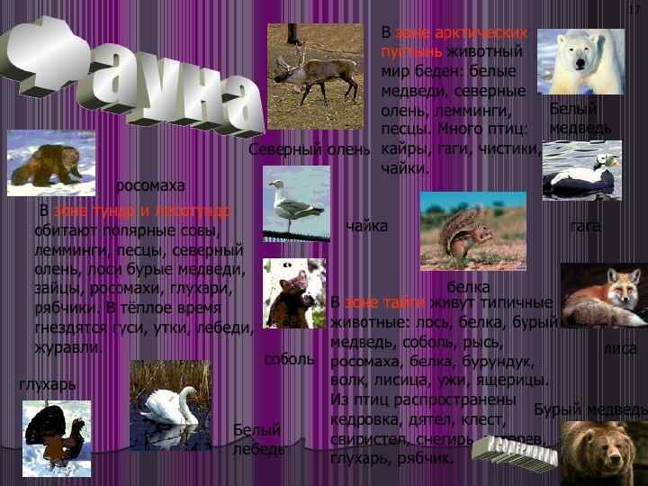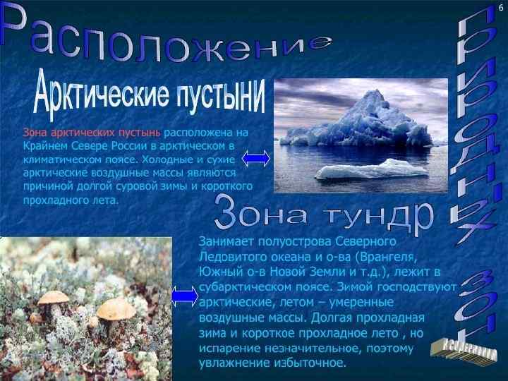 • В пределах России расположены все природные зоны, кроме тропической. А именно: зона арктических пустынь, тундры, лесотундры, тайги, смешанных и широколиственных лесов, лесостепи, пустынь и полупустынь. Арктические пустыни – бесплодные, покрытые вечным снегом земли. 16% территории России расположено за полярным кругом. Растительность здесь практически отсутствует – выживают редкие лишайники. Животный мир тоже небогат, в основном тут обитают белые медведи, белухи, нарвалы, моржи и тюлени, а также приморские птицы.