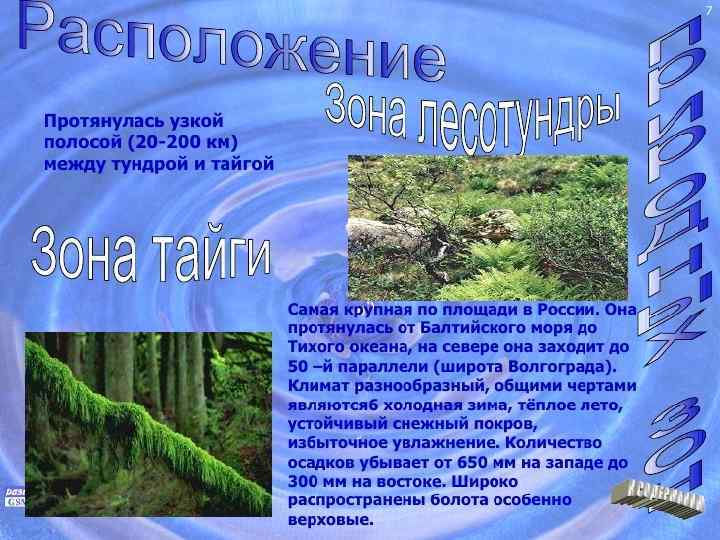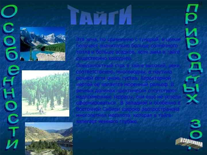• Тайга — наиболее обширная природная зона России — протянулась от западных границ России до Тихого океана. Занимает территории Восточно-Европейской и Западно-Сибирской равнин к северу от 56° — 58° с. ш. и большую часть территории к востоку от Енисея; таёжные леса доходят до южных границ России в Сибири; всего на тайгу приходится свыше 60 % площади России. В меридиональном направлении тайгу подразделяют на восточную (восточнее Енисея), с континентальным климатом, и западную, с более мягким климатом; в целом климат зоны влажный, с умеренно тёплым (на севере прохладным) летом и суровой зимой; зимой — устойчивый снежный покров. В широтном направлении тайга подразделяется на три подзоны — северную, среднюю и южную тайгу. В западной тайге густые еловые и пихтовые леса на заболоченных землях чередуются с сосновыми лесами, кустарниками и лугами на более лёгких почвах. Подобная растительность характерна и для восточной тайги, но там бо льшую роль играет не ель, а лиственница. Хвойный лес, однако, не образует непрерывный массив, а разрежен участками берёзы, ольхи, ивы (в основном по долинам рек), на переувлажнённых территориях — обширными болотами. В пределах тайги широко распространены пушные звери — соболь, белка, куница, горностай; обитают лось, бурый медведь, росомаха, волк, ондатра. [13]: 84 -109