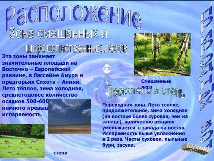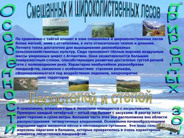 • Зона лесостепи является, как и следует из названия, переходной между лесной зоной и степью; тянется почти непрерывной полосой от границ. Центральной Украины через Восточно-Европейскую равнину, юг Урала и Западную Сибирь до Алтая. Средняя температура июля до 21 °C, января до − 8 °C в европейской части и до − 18 °C в Западной Сибири. Почвы — серые лесные и чернозёмные (последние в северной части зоны в основном оподзоленный и выщелоченные); в Западной Сибири также распространены слабо выщелоченные лугово-чернозёмные почвы. Леса с преобладаниемдуба и липы (а также клёна и вяза в Заволжье) в Европейской части страны и с преобладанием берёзы и осины в Азиатской части (в Западной Сибири называемые колками) чередуются со степными участками, всё более расширяющимися к югу, где лесостепь постепенно переходит в степь. [13]: 84 -109