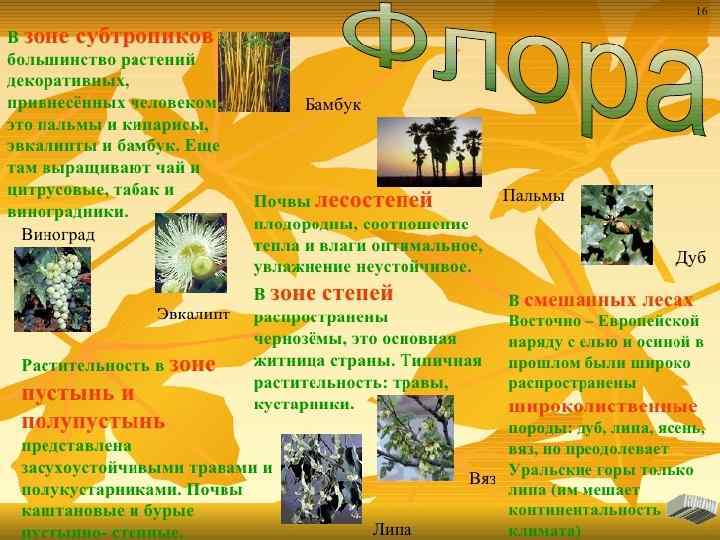 • • Степь Протяжённость степи с севера на юг в Европейской России — около 200 км. Широкая полоса степи простирается от южной Украины по южной части. Восточно-Европейской равнины и северу Казахстана к Алтайским горам. Участки лесостепи и степи встречаются в горных котловинах Южной Сибири. Климатические условия изменяются при движении с запада на восток; сибирские степи отличаются сухостью, суровой зимой и большой контрастностью температур сравнительно с европейскими. Увлажнение недостаточное (так, в кулундинских степях выпадает менее 400 мм осадков) и неустойчивое. Коэфицент увлажнения 1. Основу степной растительности составляют ковыль, типчак, мятлик, овсяница, пырей, полынь, степные кустарники (карагана, спирея и др. ). В степях произрастают также мхи (на севере) илишайники (на юге); в районах с тёплой весной распространены эфемеры и эфемероиды; на севере велика роль мезофильного разнотравья. Лесная растительность присутствует, главным образом, в речных долинах и низинах. В западной части России естественные степные ландшафты встречаются редко; степь почти полностью распахана (в основном под зерновые культуры). Представители степной фауны отличаются приспособленностью к засушливому климату; характерны различные виды грызунов (сурок и др. ), степной волк, лисица и антилопы (на юге), манулы (в степях и лесостепях Сибири). Наиболее распространённые птицы — степной орёл, пустельга, жаворонок, серая куропатка; довольно редки некогда типичные для степи дрофы. Основной тип степных почв — чернозём; название дано по почти чёрному цвету верхнего горизонта. Верхний слой почвы вследствие обилия травянистой растительности очень богат гумусом. Морозная зима и засушливое лето препятствуют разложению органического материала, и гумификация протекает интенсивно. Бо льшая часть (свыше 70 %) российских чернозёмов распахана; отмечается общая деградация чернозёмных почв. На юге степной зоны чернозёмы сменяются тёмнокаштановыми почвами, также сильно распаханными. [13]: 84 -109