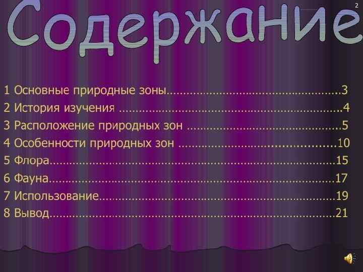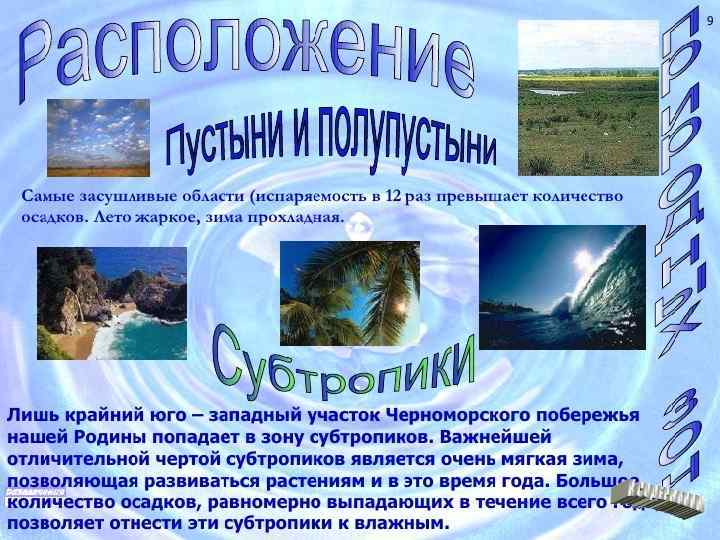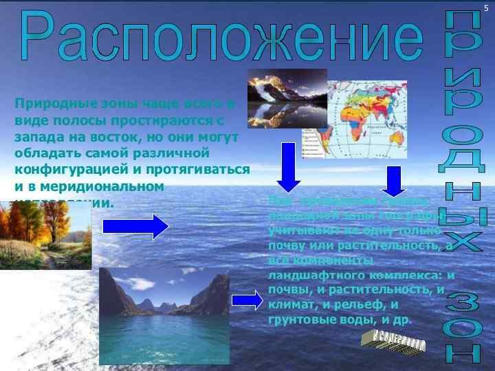 • Природные зоны берут своё название от растительности, присущей им, и других географических особенностей. Зоны закономерно сменяются от экватора к полюсам и от океанов вглубь континентов; имеют близкие условия температур и увлажнения, определяющие однородные почвы, растительность, животный мир и другие компоненты природной среды. Природные зоны — одна из ступеней физико-географического районирования.