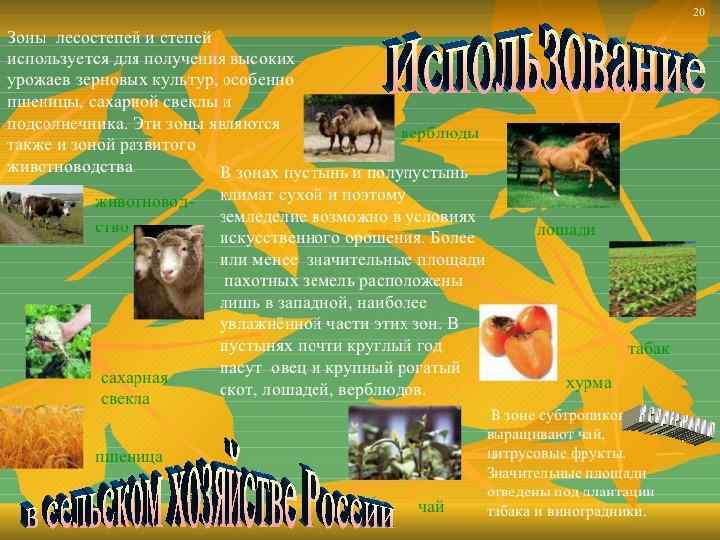 • Полупустыня и пустыня • Эти природные зоны занимают небольшую часть территории России и находятся в пределах Прикаспийской низменности. Климат сухой, континентальный. Средняя температура января до − 10 °C, июля — до 24 °C. Летом температура в тени нередко достигает 40 °C. Увлажнение крайне недостаточное. В зоне пустынь часты суховеи и пыльные бури, которые образуют холмы (барханы). Растения в этой зоне выносливы. Это полынь, верблюжья колючка и другие. Здесь также растет саксаул. К характерным для степной зоны России представителям животного мира относятся такжетушканчик, корсак; разнообразны в степи змеи и ящерицы. Почвы (каштановые, светло-каштановые, бурые пустынностепные) сильно засолены, многочисленны солончаки и солонцы. [13]: 84 -109